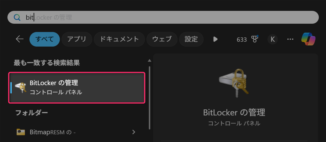 Win キーから、検索窓に”bitlocker”と入力。