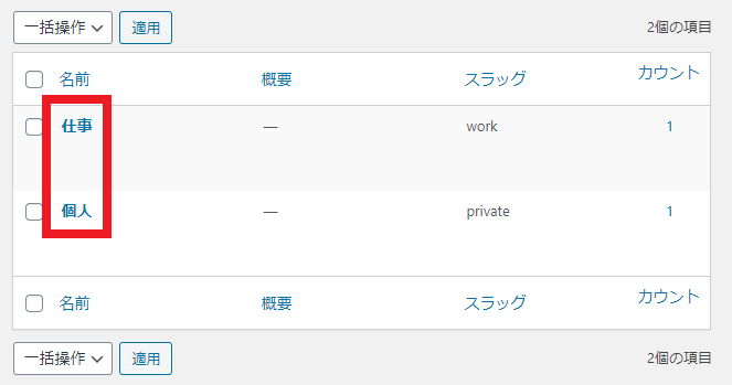 以下のとおり、「仕事」「個人」の2つのカテゴリーを新規で登録しました。