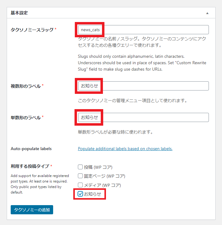 『利用する投稿タイプ』は、先ほど追加した「お知らせ」のみにチェックをしておきます。(任意)