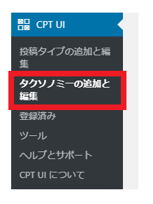 管理画面メインメニューの『CPT UI(カスタム ポスト タイプ UI)』の、『投稿タイプの追加と編集』をクリックします。