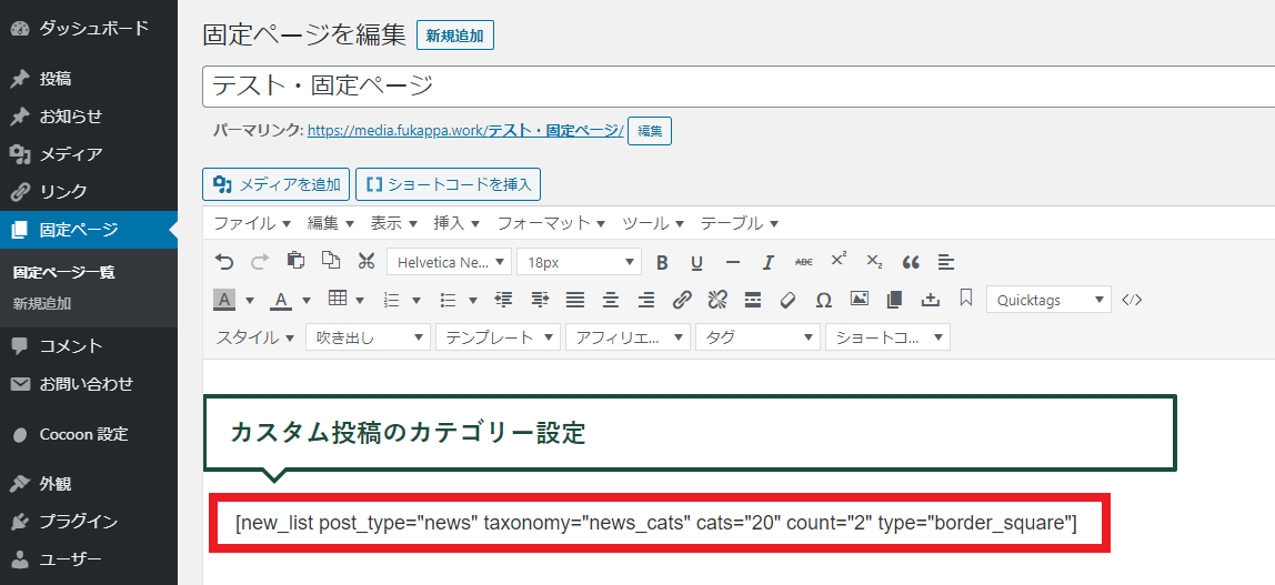 - 『taxonomy=”news_cats”』…登録したタクソノミー(カテゴリータイプ)「お知らせ」のスラッグ