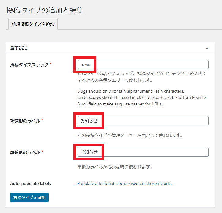 『新規投稿タイプを追加』が表示されたら、スラッグと表示名を入力します。