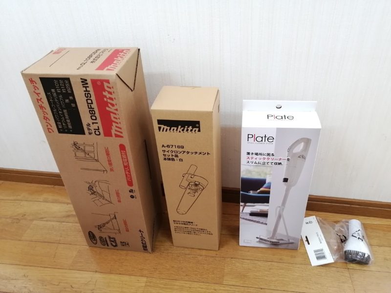 ちなみに上の写真は左から、本体・サイクロンアタッチメント・スタンド(社外品)・ラウンドブラシです。
