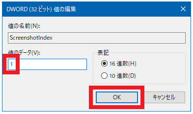以下のダイアログが表示されたら、「値のデータ」「1」(開始番号)を入力し、「OK」をクリックします。