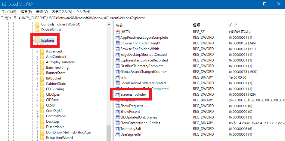 「HKEY_CURRENT」→「Software」→「Microsoft」→「Windows」→「CurrentVersion」→「Explorer」の順に階層を下っていきます。