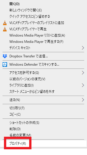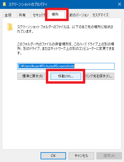 「スクリーンショット」のフォルダを右クリックし、「プロパティ」を選択します。