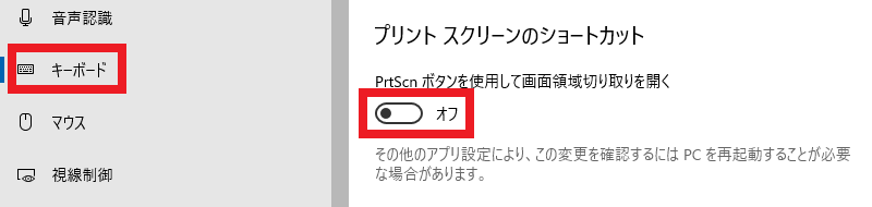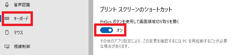 「オン」にすると、PrtScnボタンで「画面領域切り取り」が起動できるようになります。