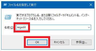 「ファイル名を指定して実行」(←WinRで起動)の入力欄に『regedit』と入力します。