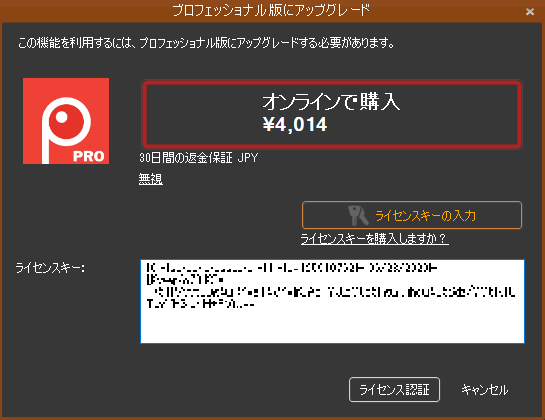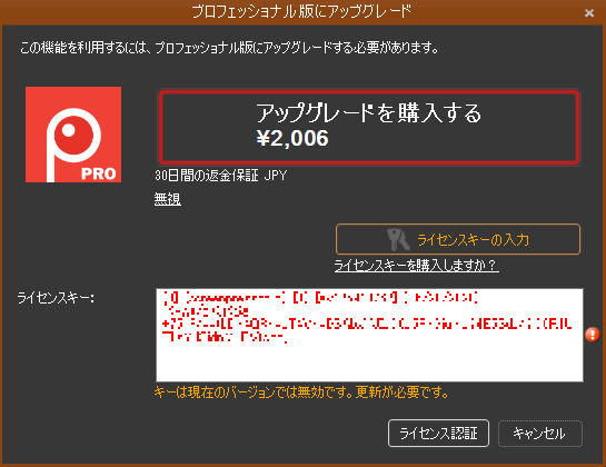 もともと「プロ版」を使っていたので、そのまま「ライセンス認証」をクリックしましたが、認証が通りません。