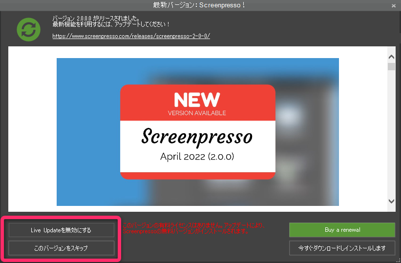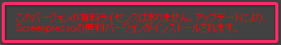 『Screenpresso』のアップデートが来ていたので、いつものように実行してみると、「プロフェッショナル版」へのアップグレードを要求するメッセージが…。