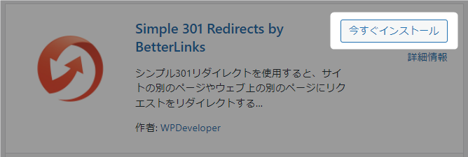 管理画面の「プラグイン」→「新規追加」から、「プラグインの検索」で『Simple 301 Redirects by BetterLinks』をインストールします。