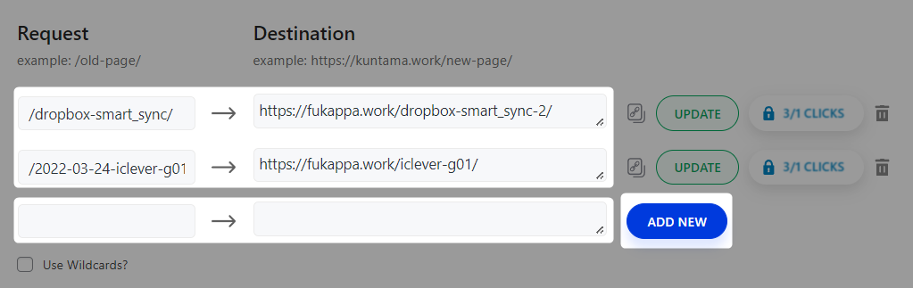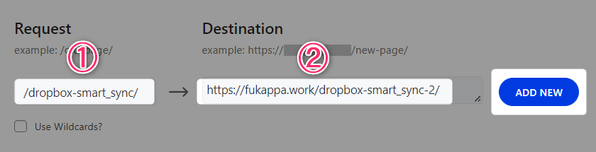 ①に移動元のURL、②に移動先のURLを入力し、「ADD NEW」をクリックします。