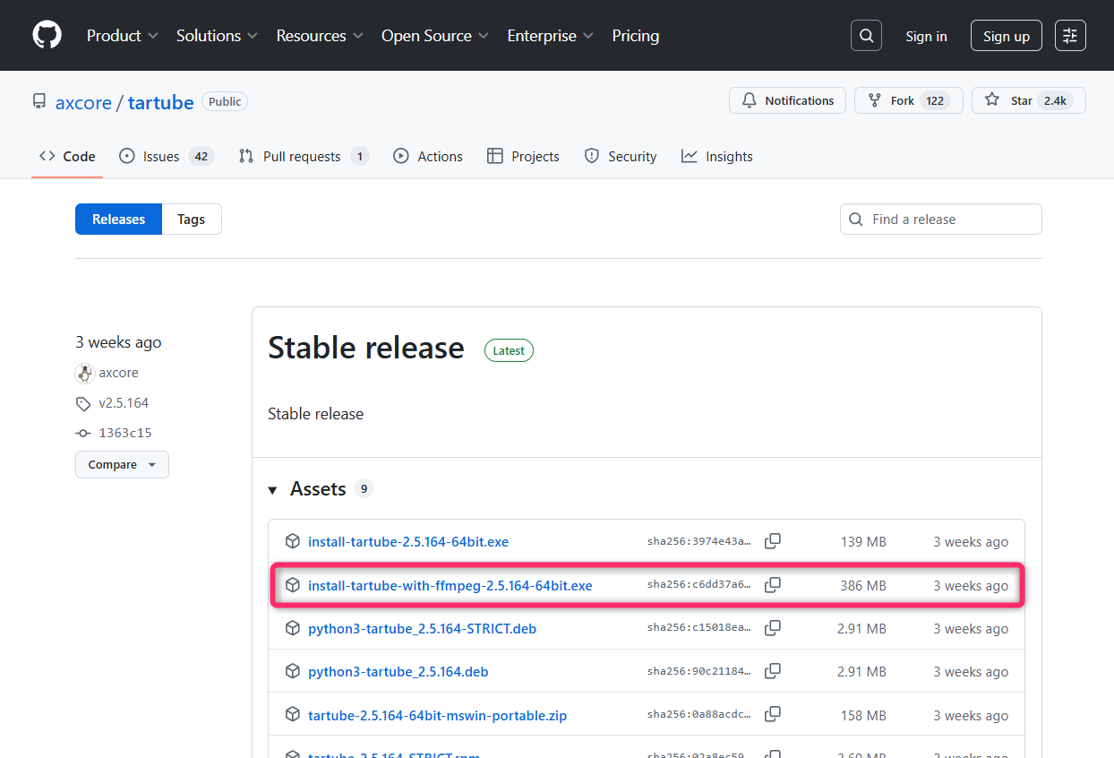 一覧の中から「install-tartube-with-ffmpeg-2.5.164-64bit.exe」をクリックしてダウンロード。