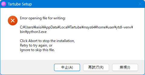 初めてのインストールのときにはなかったエラーが出てしまい先に進めなくなりました。(※このブログのためにいったんアンインストールし、今回が2度目のインストールでしたが。)