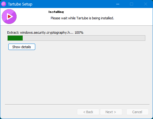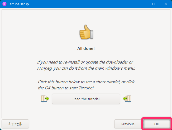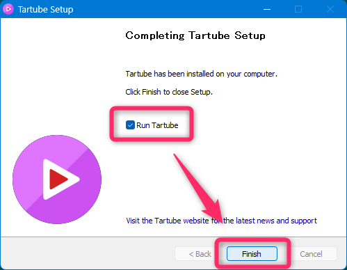 「Run Tartube」(Tartubeを起動する)にチェックを付け、「Finish」(完了)をクリックします。