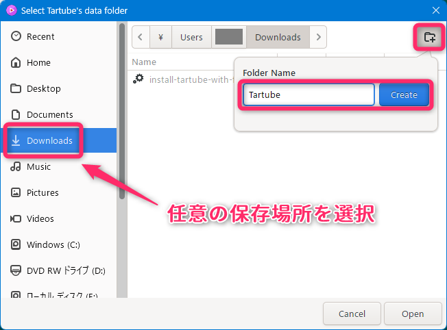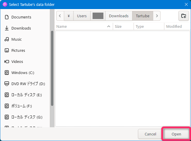 新規作成したフォルダが選択されたそのままの状態で「Open」(開く)をクリック。