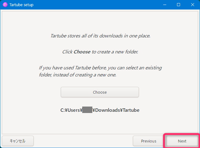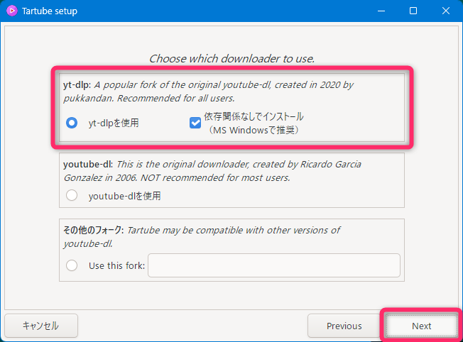 デフォルトの「yt-dlp」そのままで「Next」(次へ)をクリック。