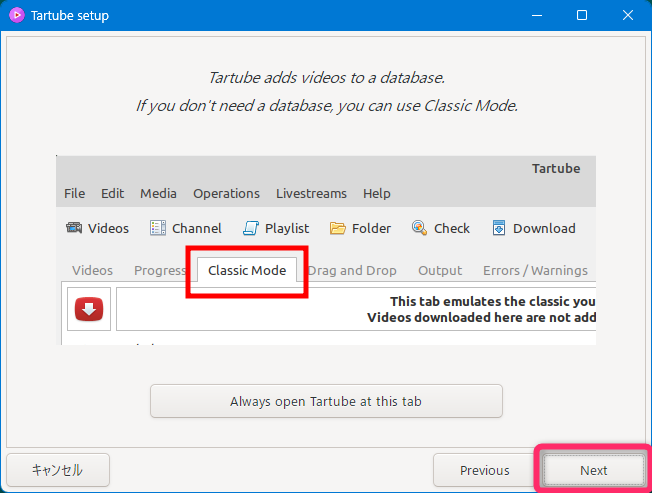 「データベースが必要ないならクラシックモードを使ってください」と書いてあり、「Always open Tartube at this tab」をクリックすればクラシックモードが起動時のデフォルトになるのだと思われる。