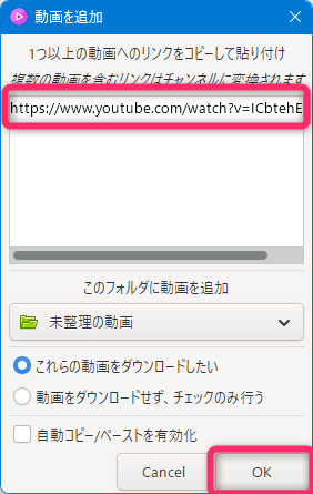 「動画を追加」のダイアログが表示され、先ほどコピーしたURLがここに貼り付られた状態になっているのを確認して、「OK」をクリックします。