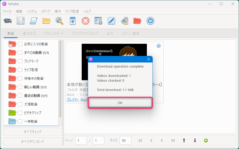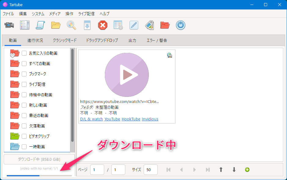 最初に設定した保存先の「未整理の動画」フォルダに、動画とサムネイルその他情報がダウンロードされます。