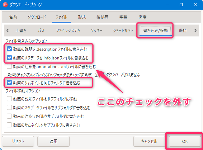右側に「書き込み/移動」のタブが出てきたらそれを選択し、下の画像のチェックをすべて外して「OK」をクリックします。(※私の場合はローカルで管理するのでこれらは不要ですが、このソフトのデータベースを使用して管理する場合には必要なものだと思われる。)
