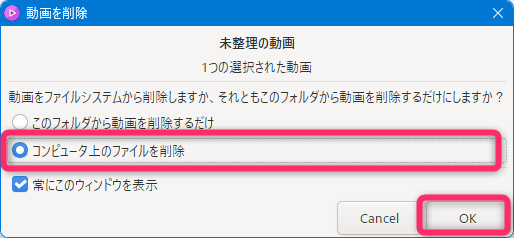 「このフォルダから動画を削除するだけ」の意味は分かりませんが、試しにこちらを選択したところ、保存先のフォルダの動画は削除されませんでした。