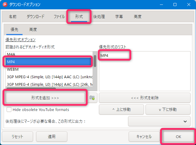 これも先ほどのダウンロードオプションを開き、「形式」で左側から任意のフォーマットを選択して「形式を追加」をクリックし、最後に「OK」をクリック。