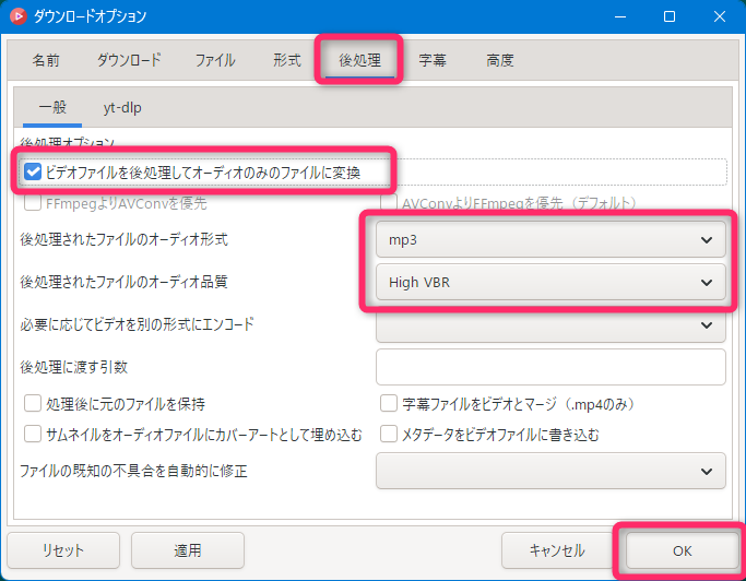 「ビデオファイルを後処理してオーディオのみのファイルに変換」にチェックを付け、形式と品質はそれぞれ「mp3」・「High VBR」を選択し「OK」をクリックします。(形式は任意、品質のデフォルトは「Medium VBR」です。)