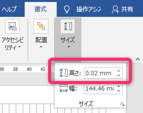 書式」タブから「サイズ」で、「高さ」に「0.02」と入力します。