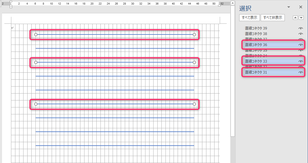 水平線や垂直線を範囲指定で選択できないとはいえ、他の図形と同様に一括で操作したい場面は多々あります。