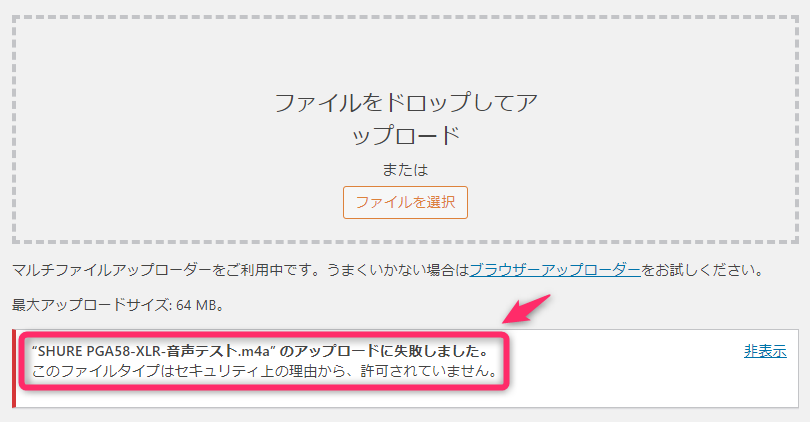WordPressのメディアライブラリにM4A(MPEG-4)の音声ファイルをアップロードしようとした際に、このメッセージが表示されてしまいました。(↓)